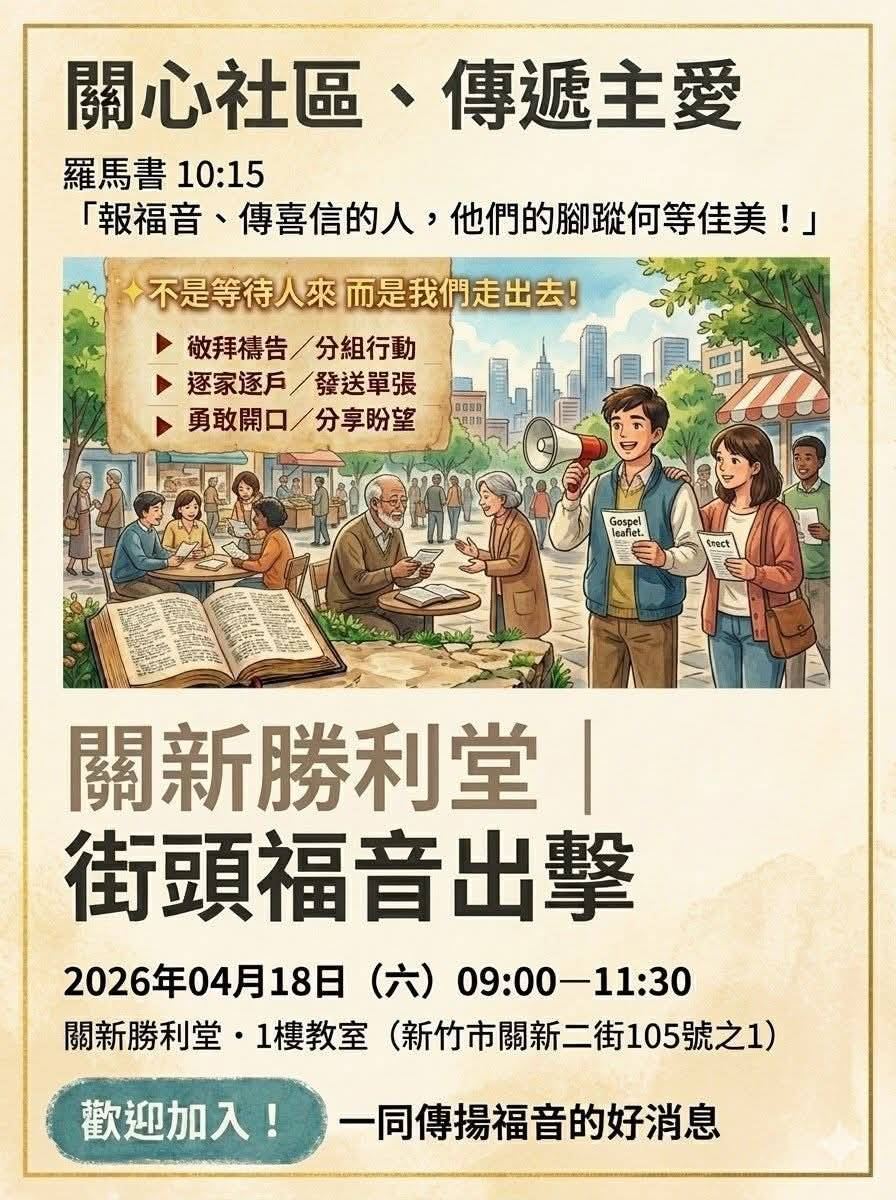 街頭福音出擊【關心社區、傳遞主愛】115.4.18關新勝利堂9:00〜11:30