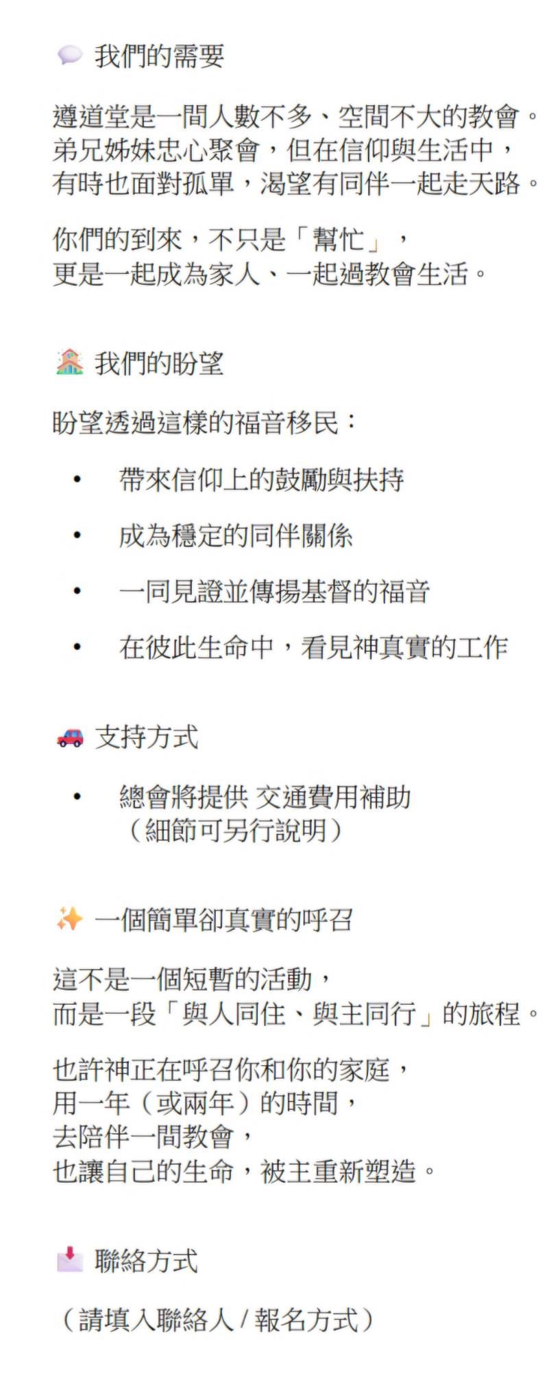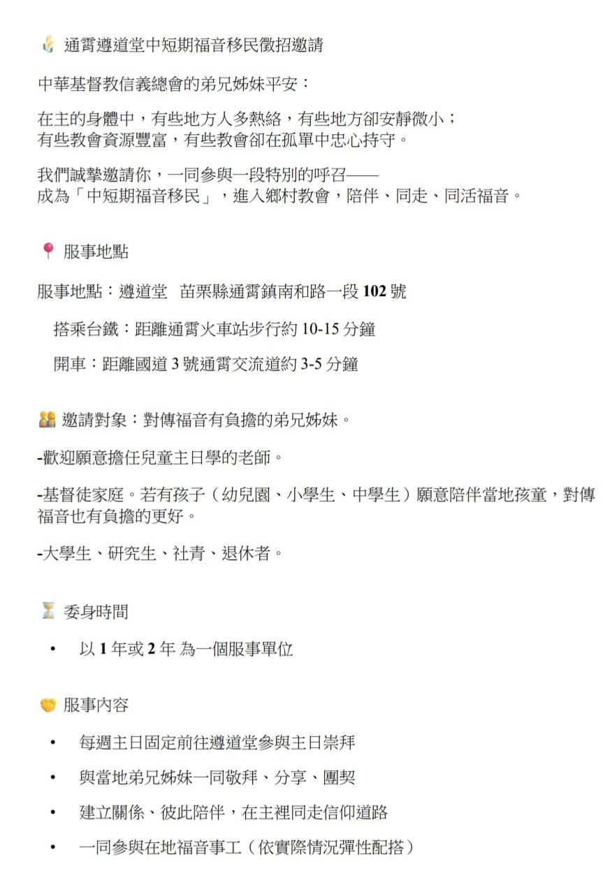 【通霄遵道堂中短期福音移民徵招邀請】